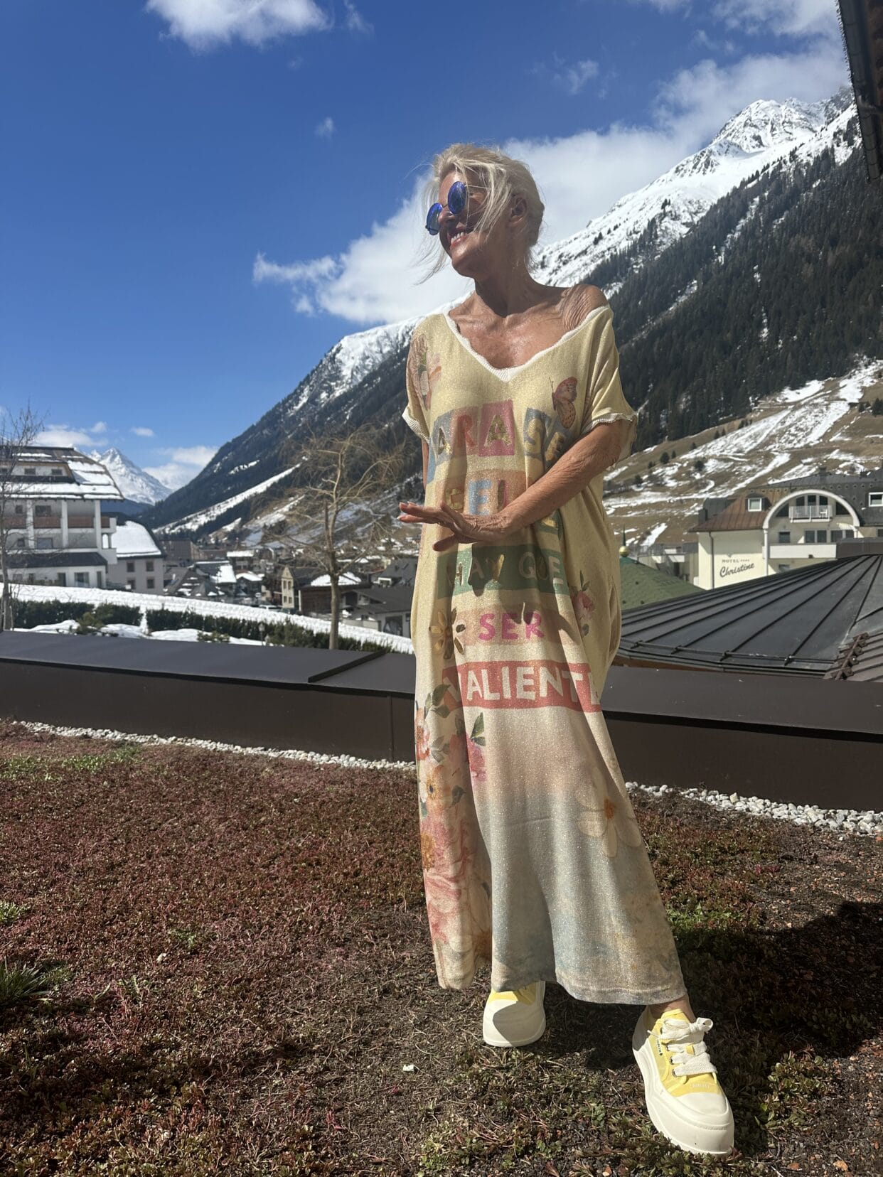 Maxikleid mit Lurex-Faden und Goldbordüren an V-Ausschnitt und Ärmchen.