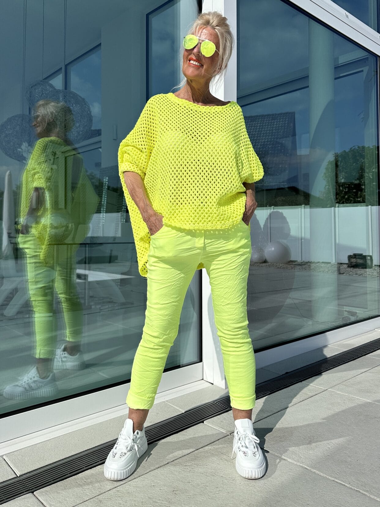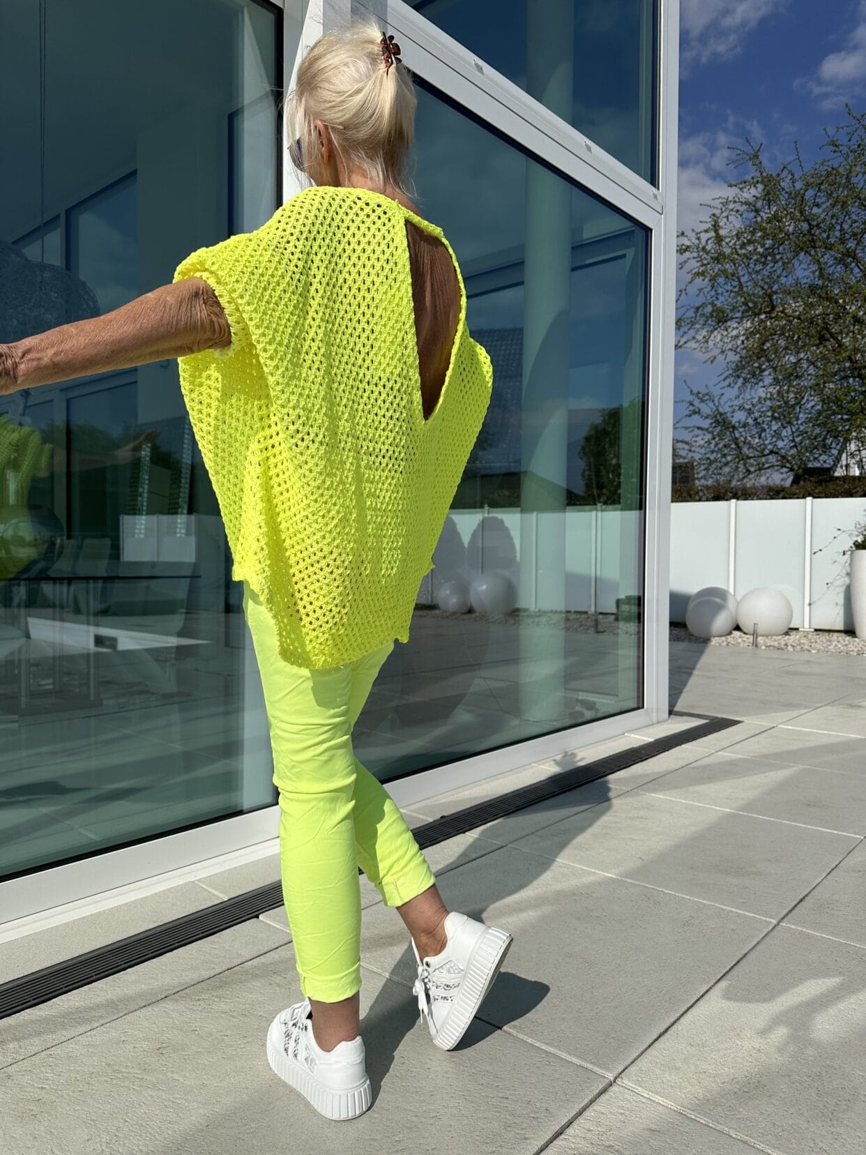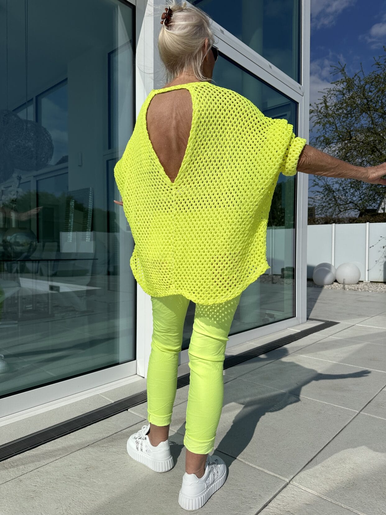 Gelber Langarm-Lochpulli mit tiefem Rückenausschnitt.