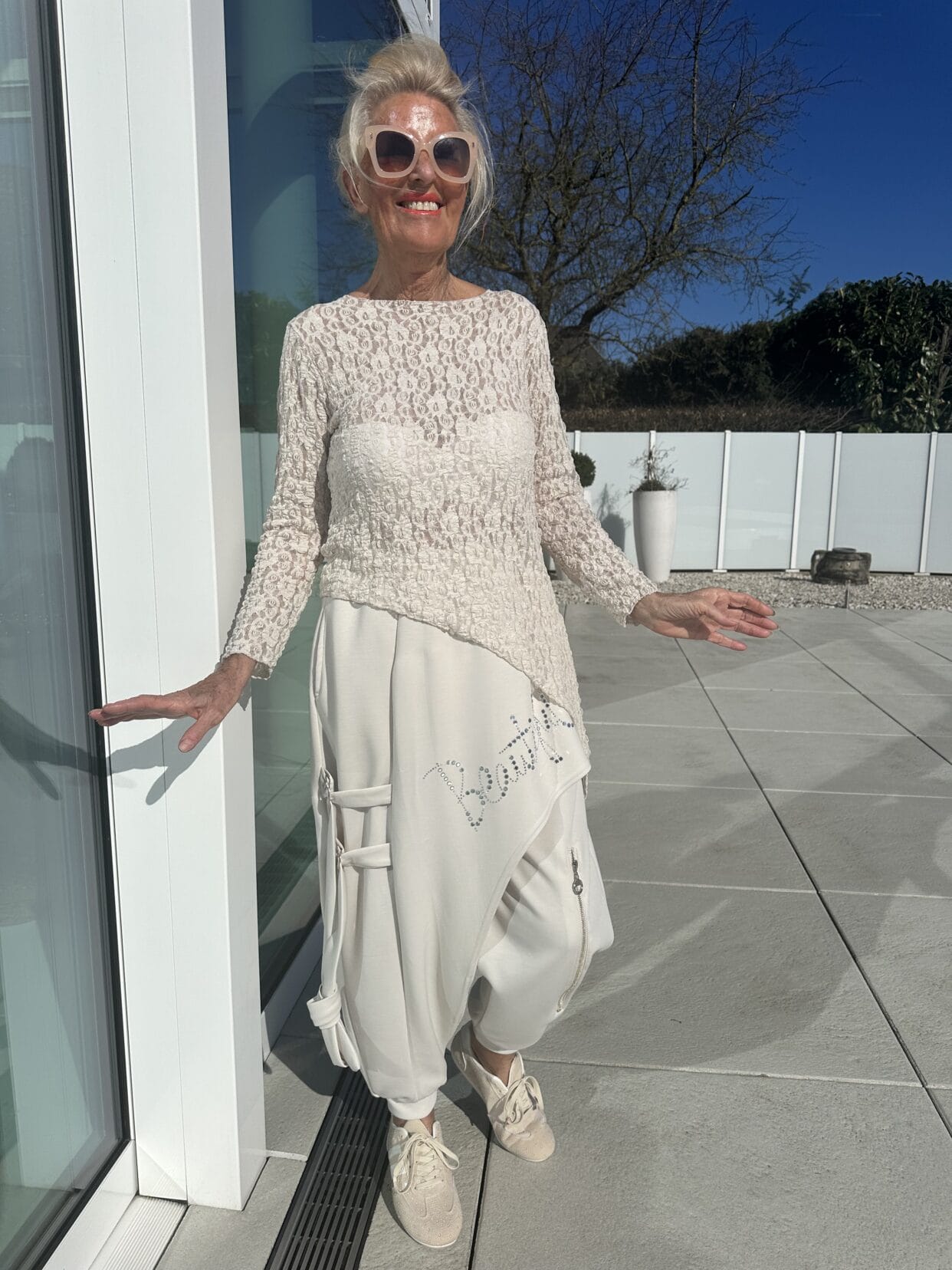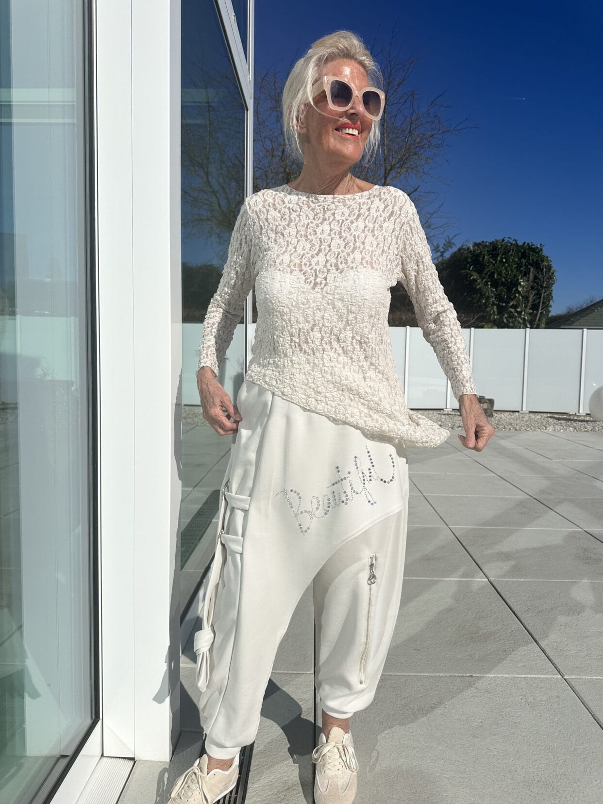 Schräg verlaufender, leichter Spitzenpulli.