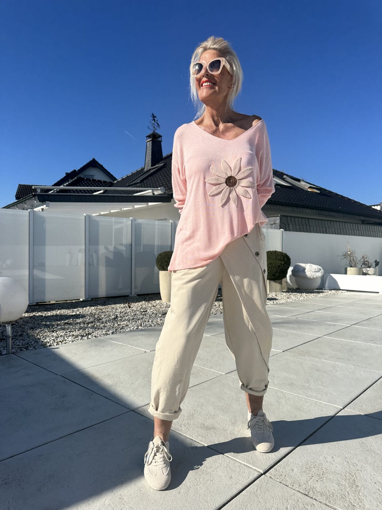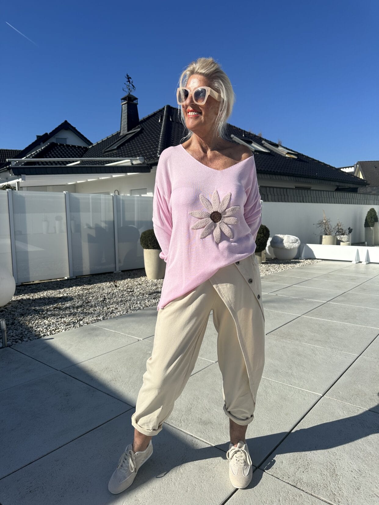 Leichter Sommerstrick in 3 Uni-Farben mit aufgenähtem Blütenmotiv.