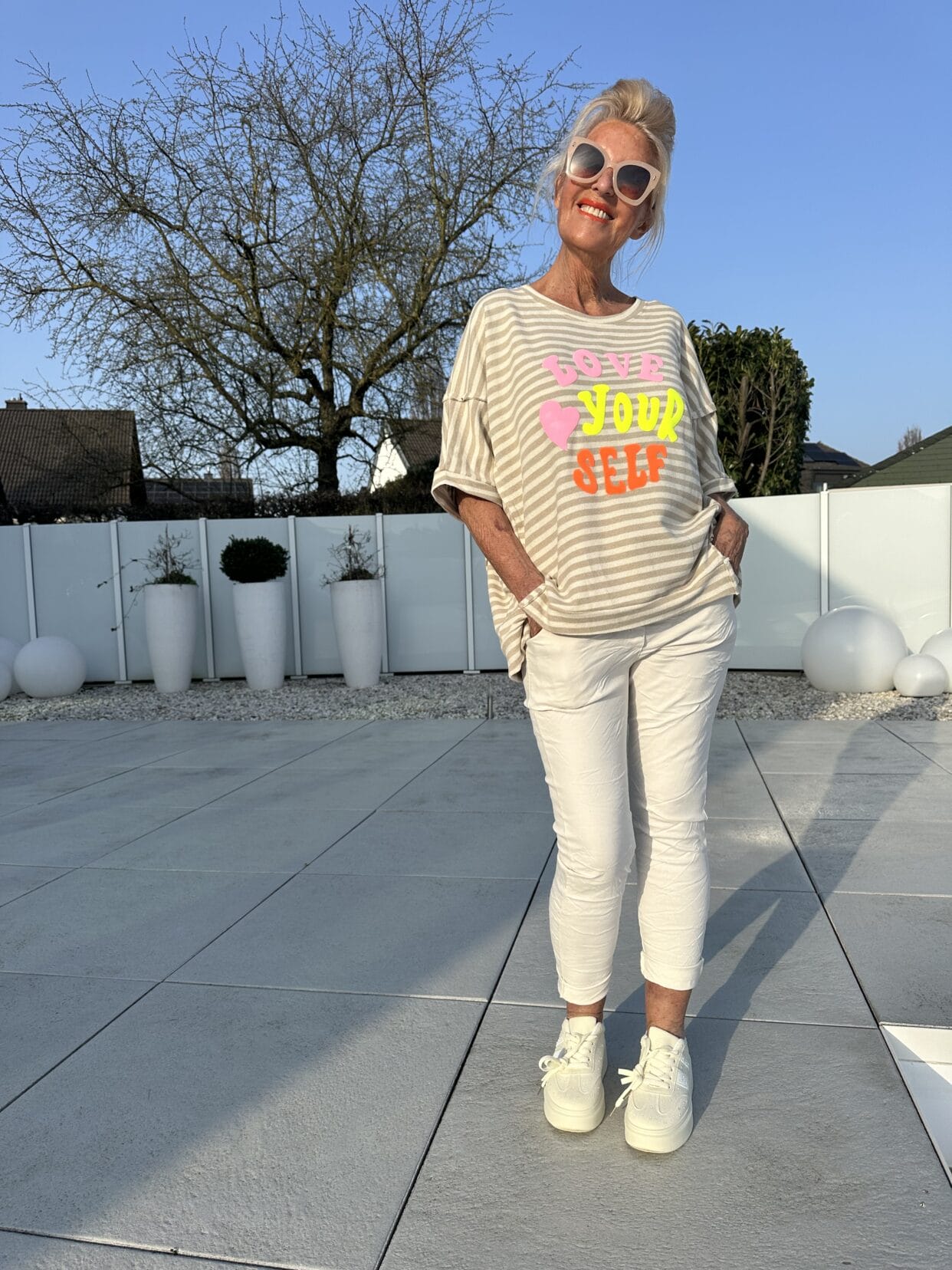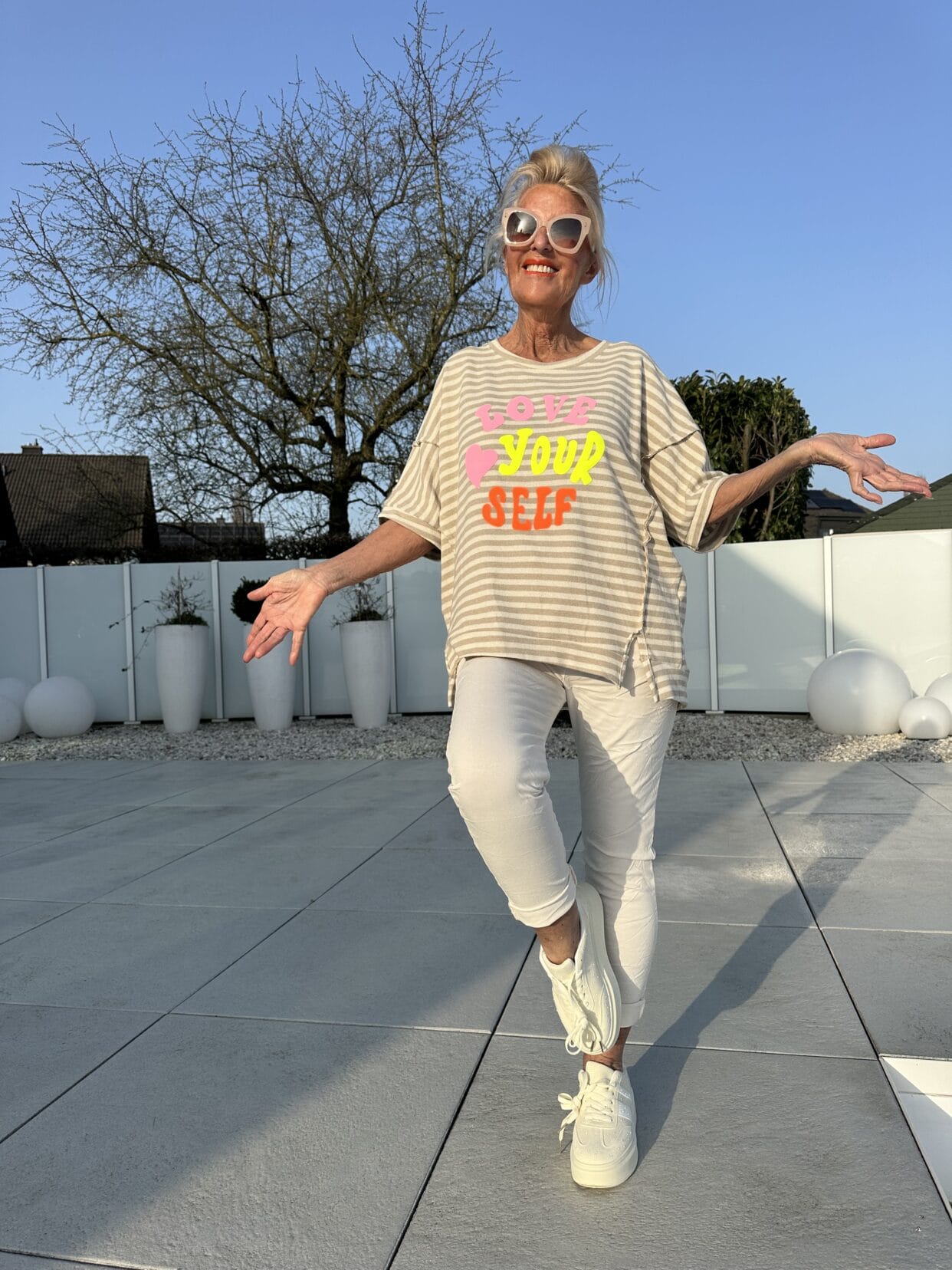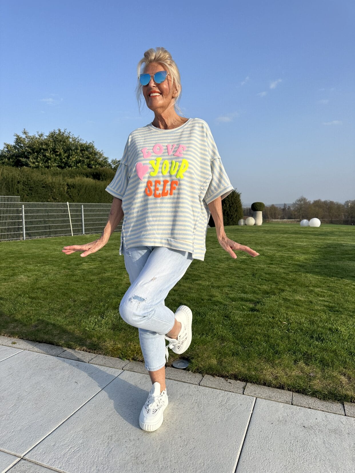 Gestreifter Kurzarm-Sommerpulli mit seitlichen Schlitzen, gedoppelten Nähten und einem knalligen Text-Motiv in zwei Farbstyles.