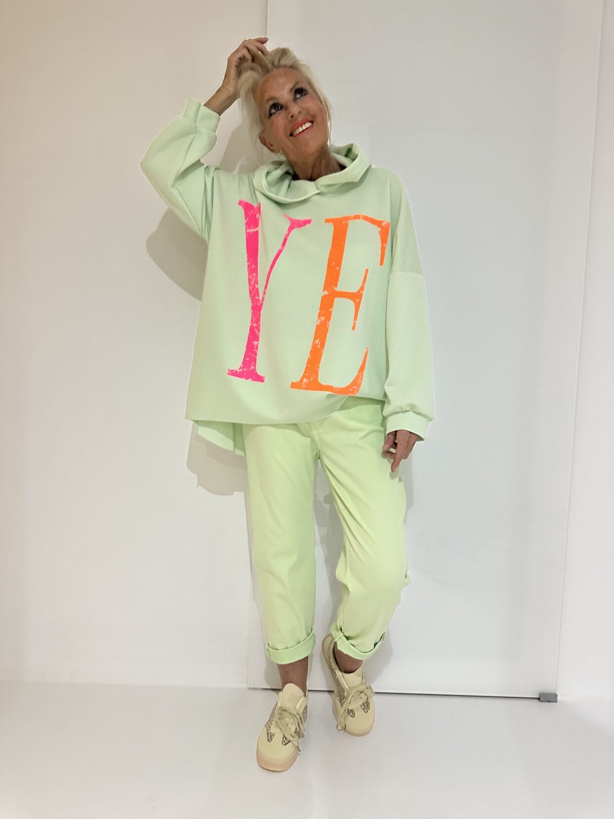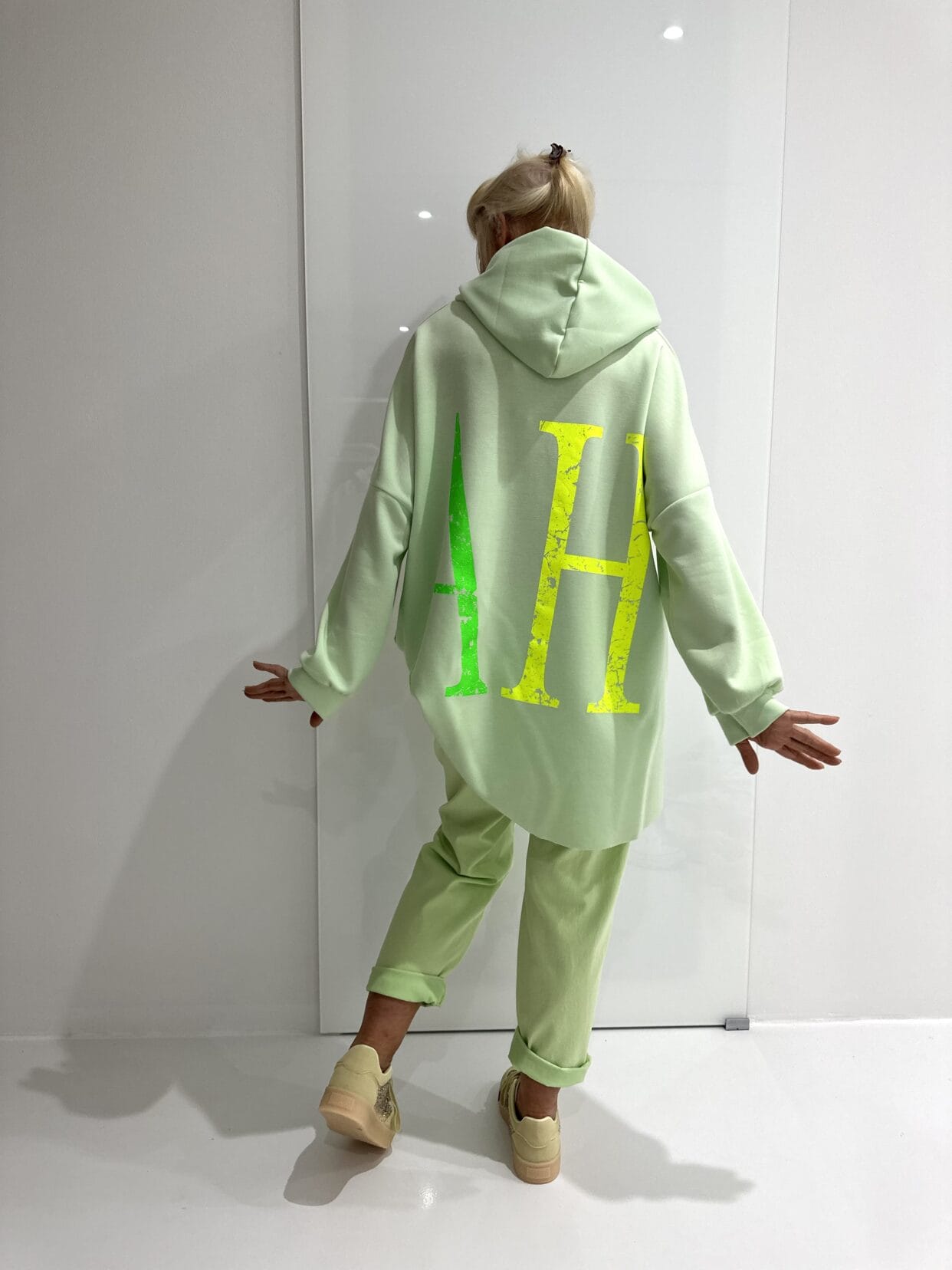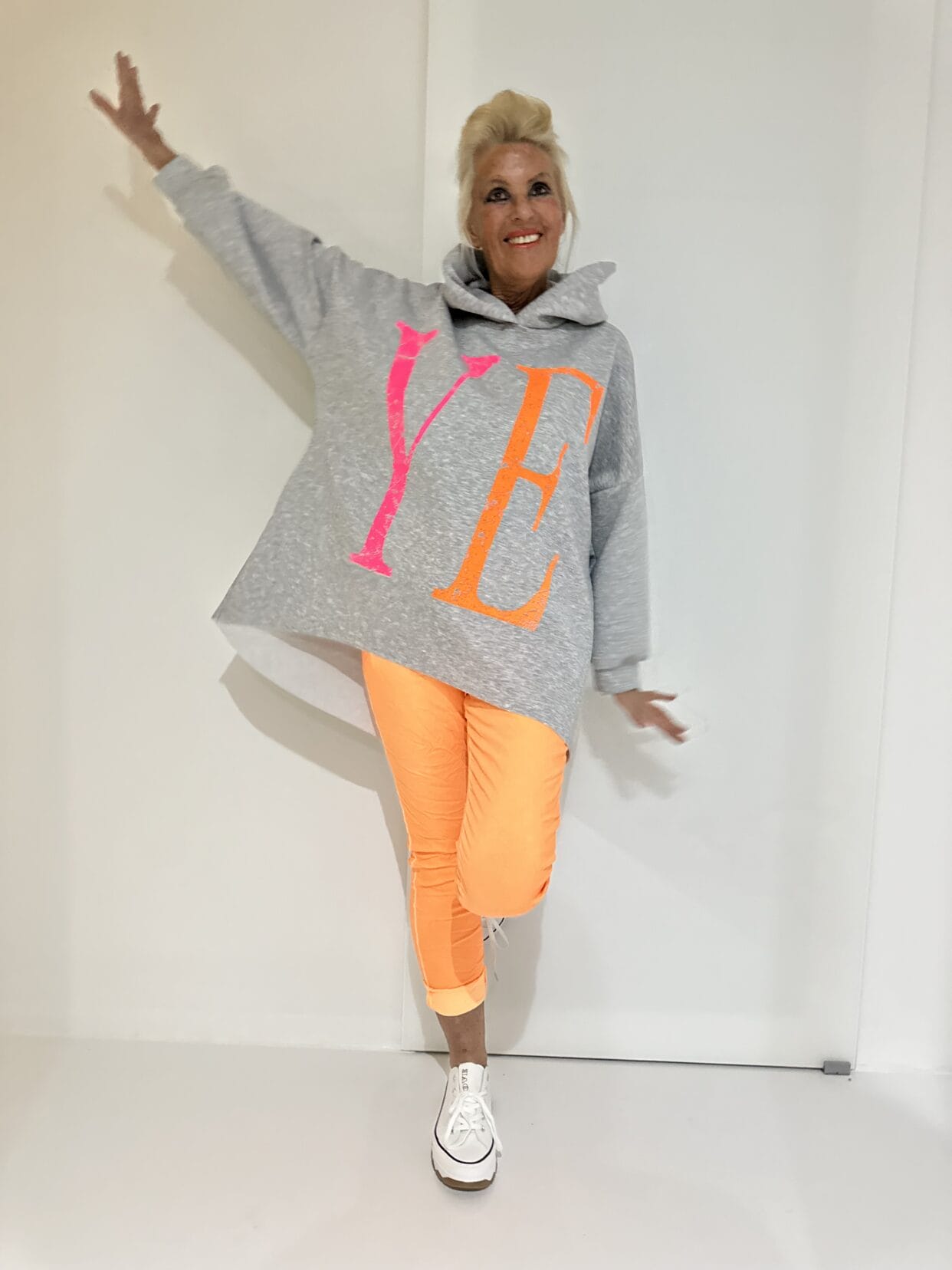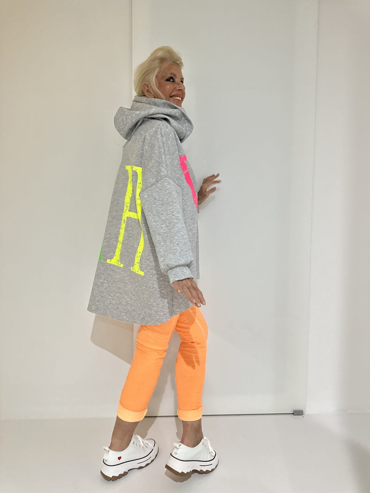 Kapuzenshirt mit knalligem Text-Motiv auf Vorder- und Rückseite und seitlichen Taschen.