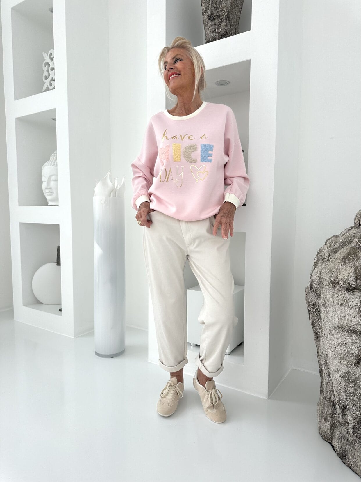 Leichtes Langarmshirt in frischen Frühlingsfarben mit farbigem Text-Motiv.
