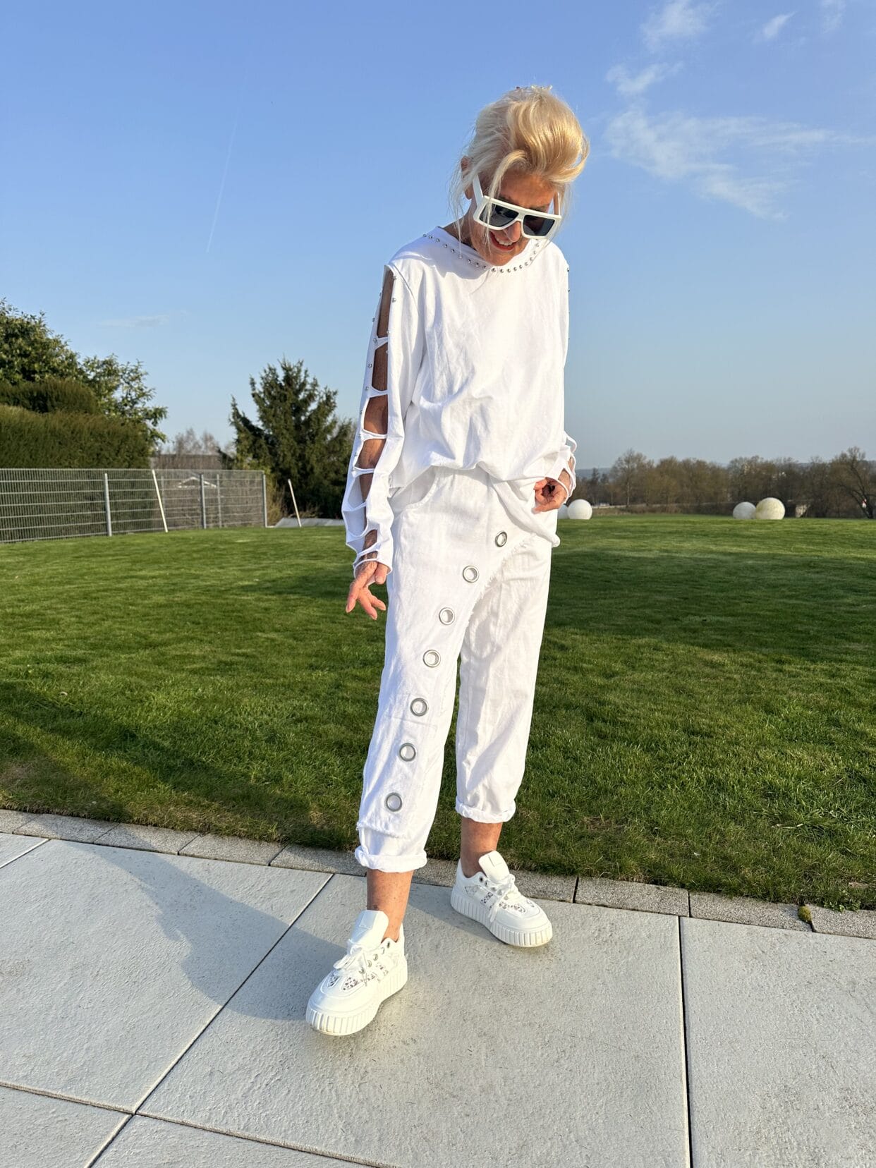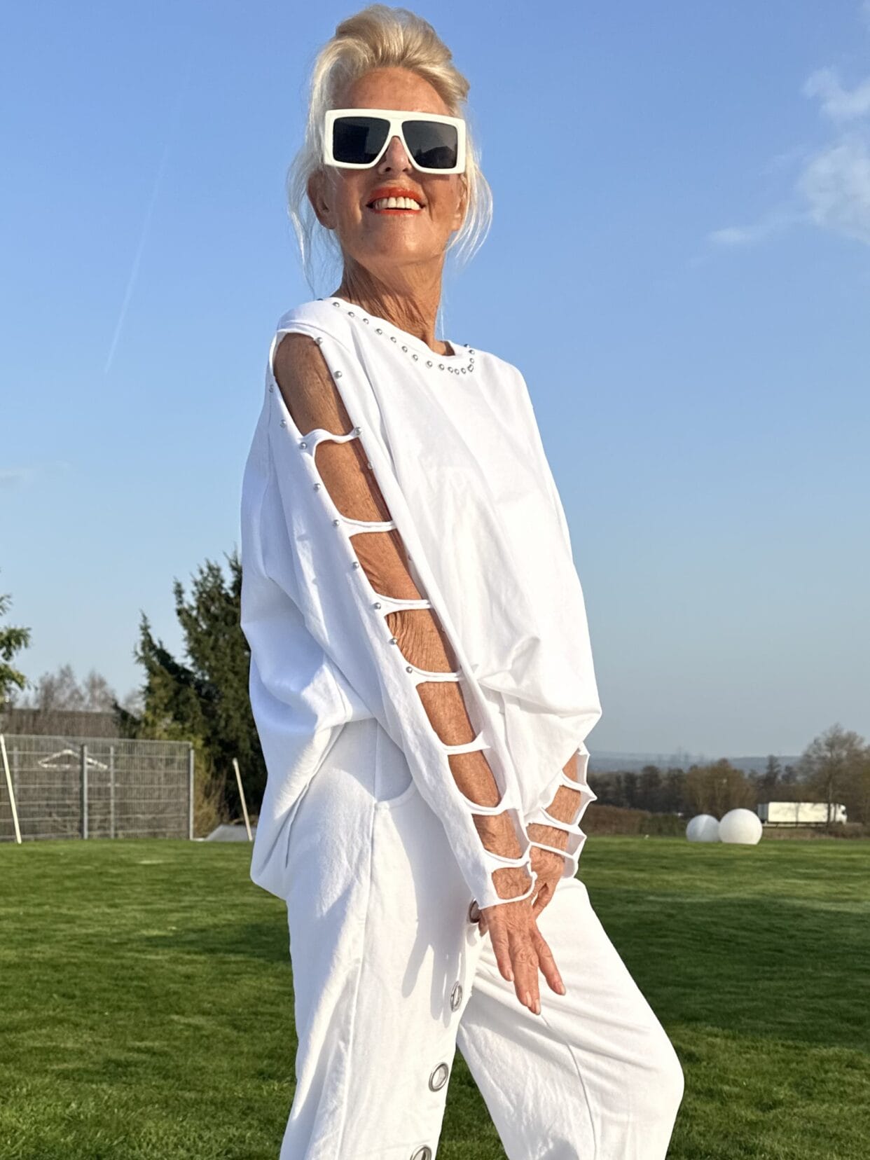 Unifarbenes Langarmshirt mit offenen Armen und silbernen Perlen an Armen und Dekollete.