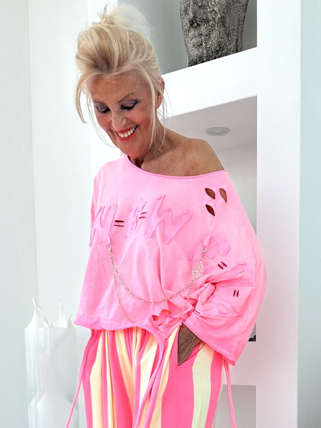 Kurz geschnittenes Used-Shirt mit Doku-Kette.