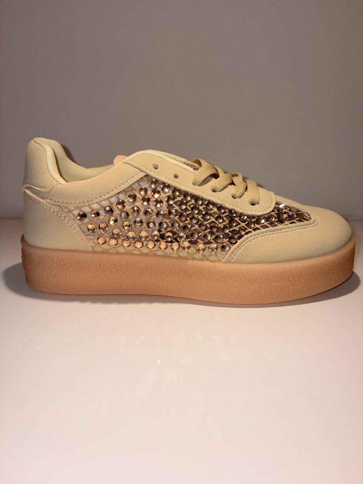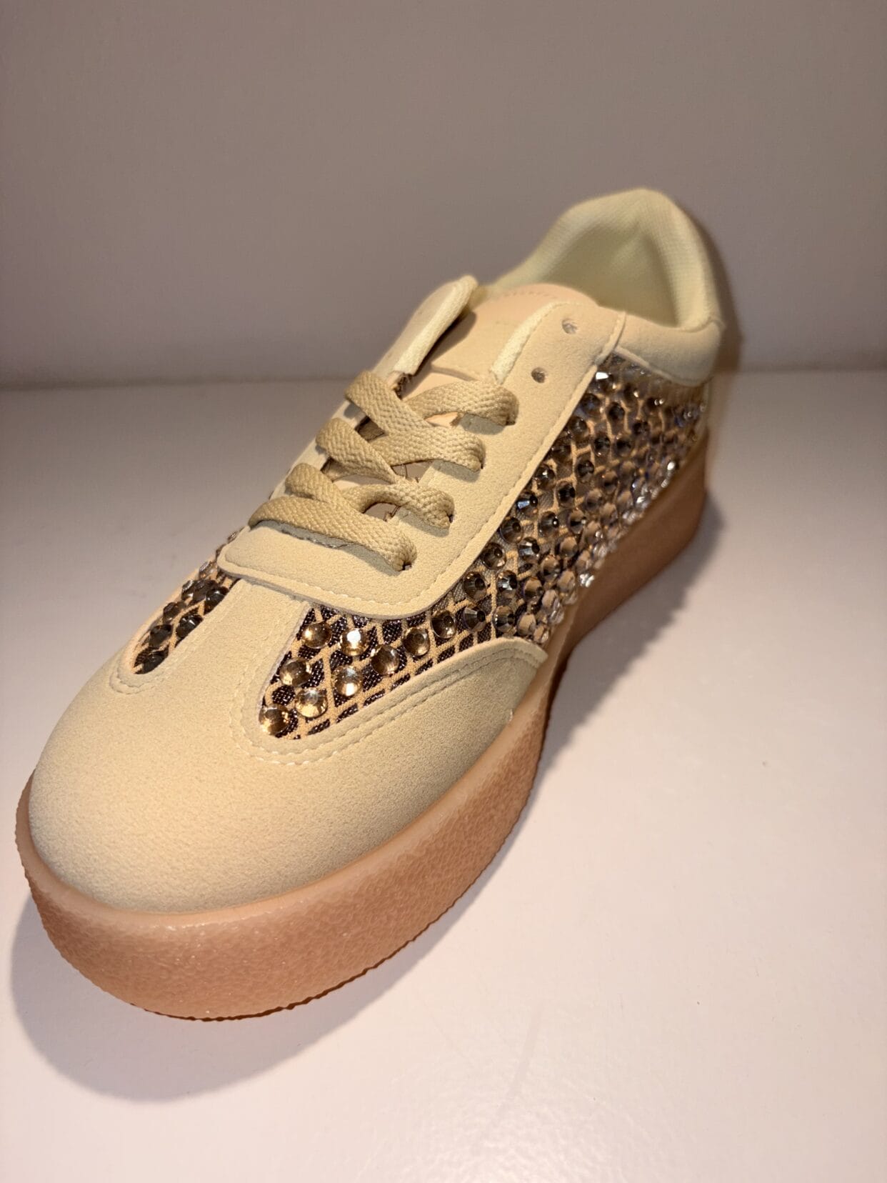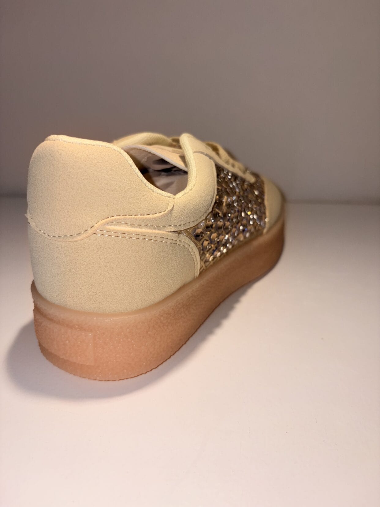 Hellgelber Sneaker mit dicken Glitzersteinen.