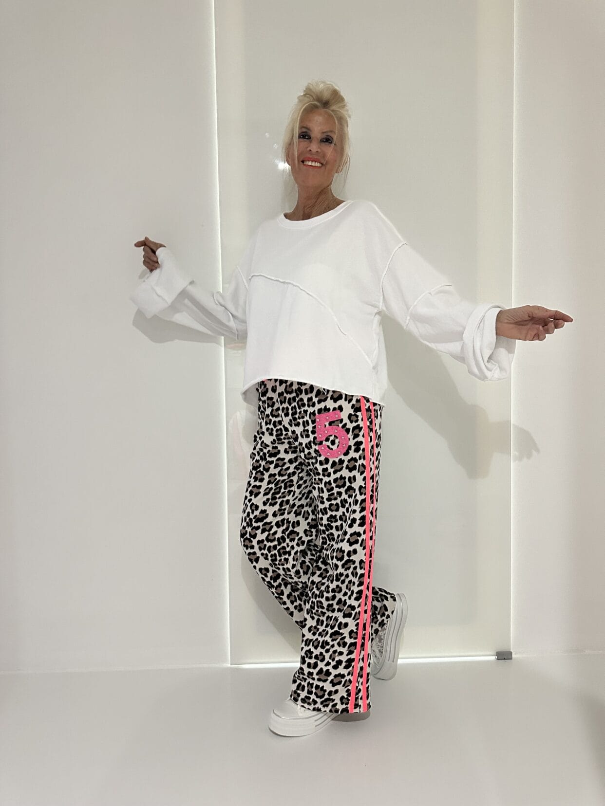 Weißer Sweater mit verstärtken, ausgefransten Nähten.