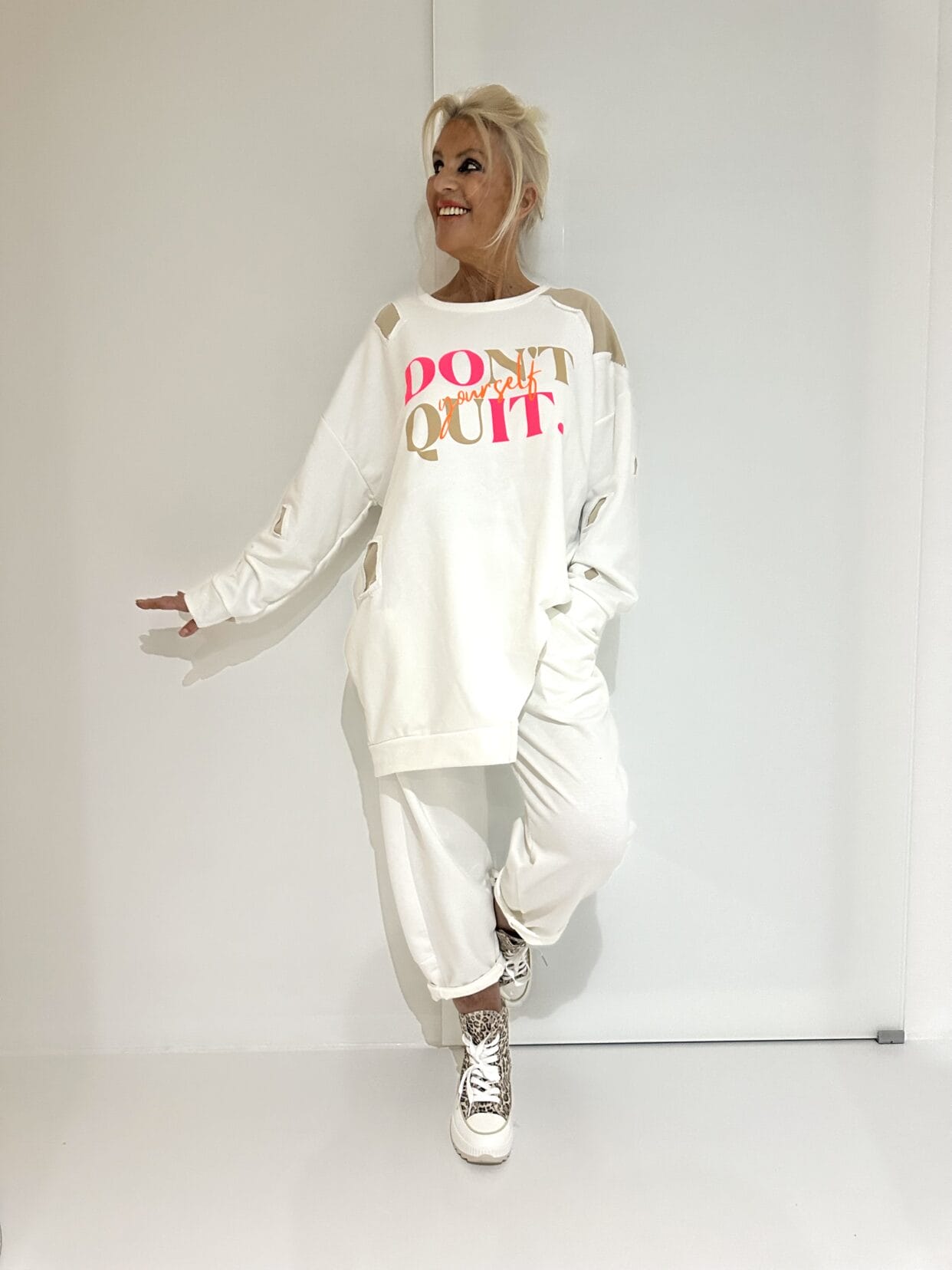 Weißer Longweater mit camelfarbenen Einsätzen und knalligem Text-Motiv, im Bund hat der Sweater einen gefransten Einschnitt..