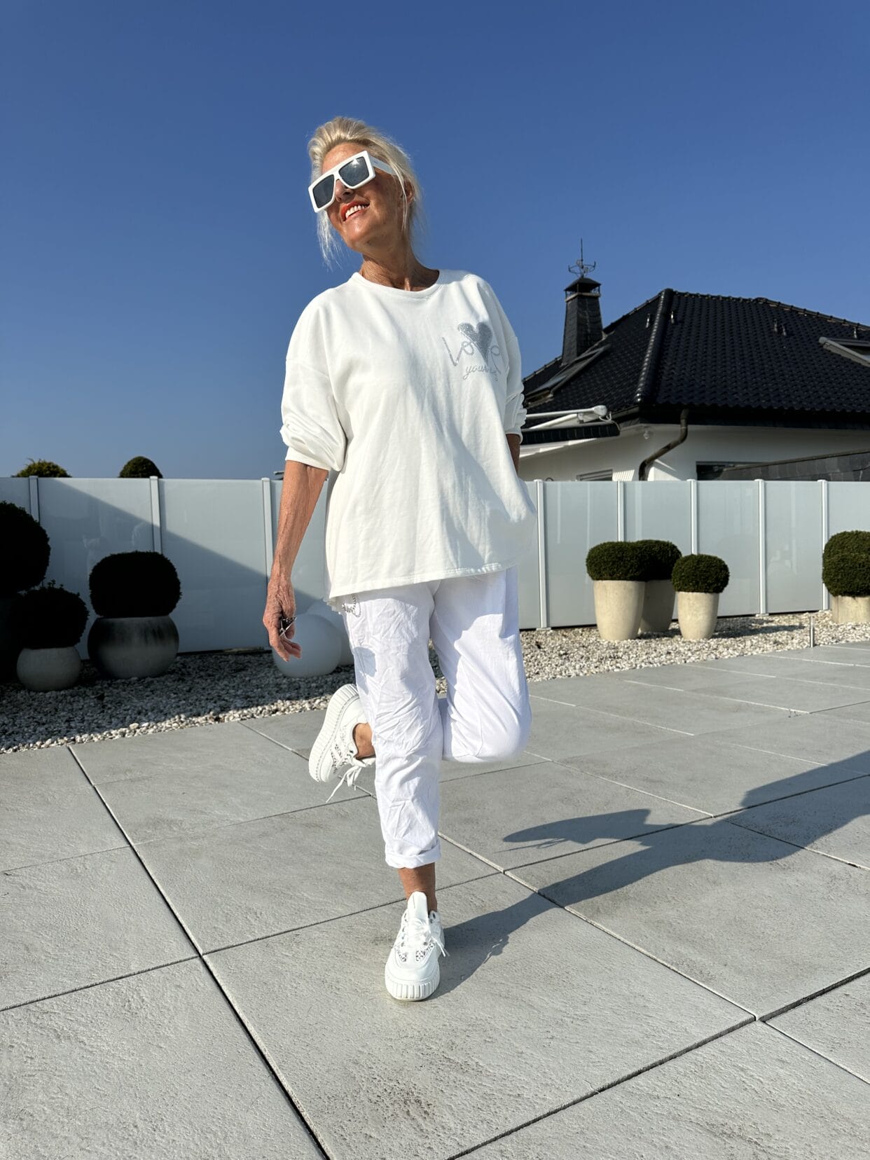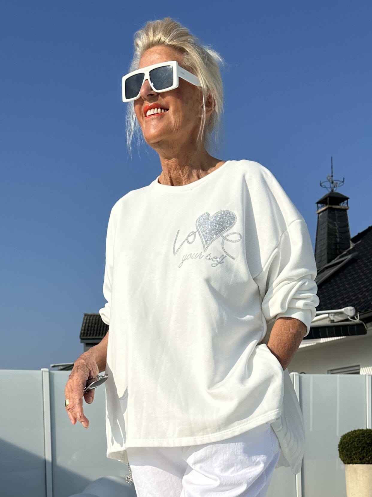 Weißer Sweater mit Plissee-Rücken und Glitzer-Love-Motiv auf der Brust.