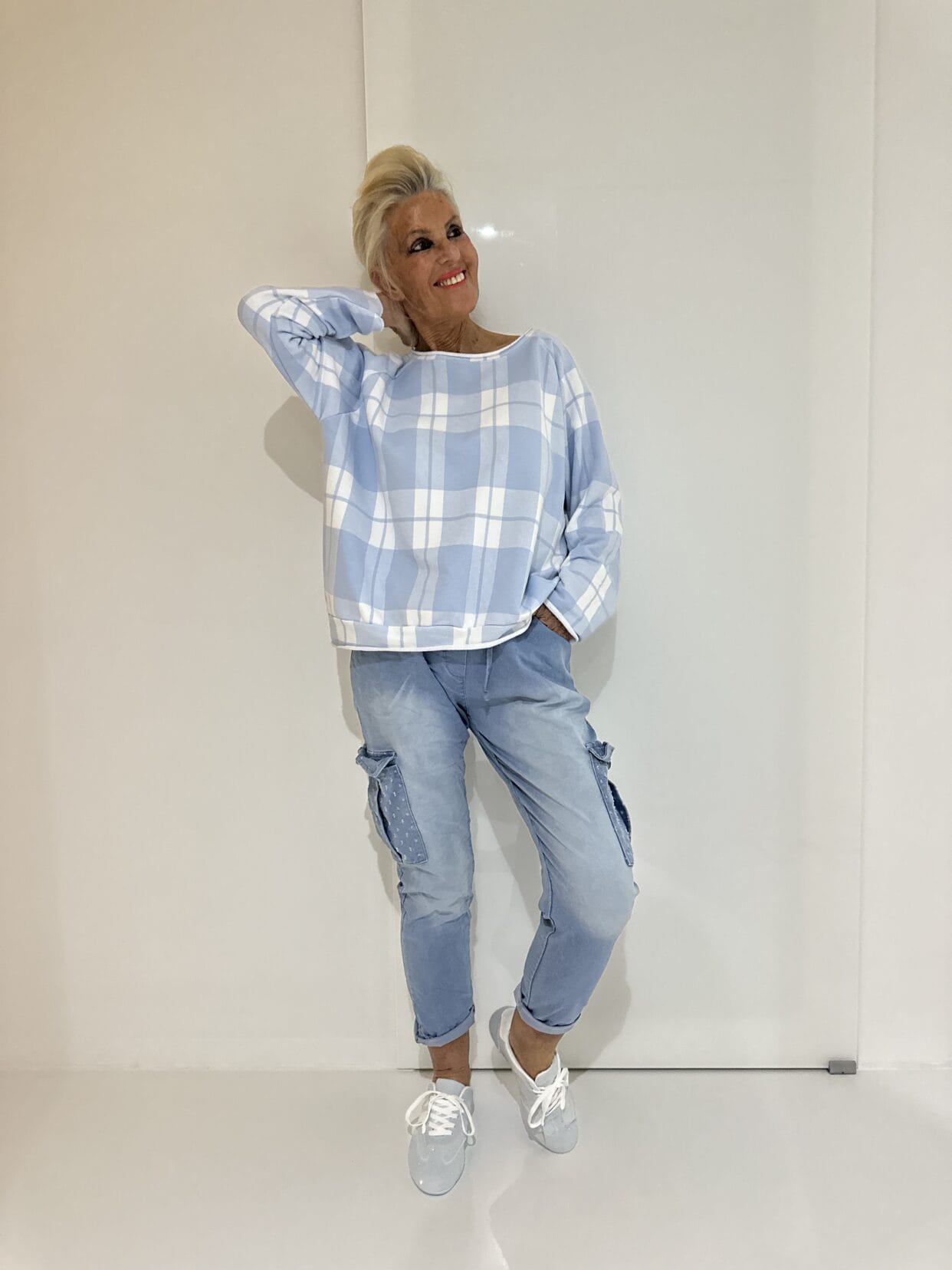 Kastiger Oversize-Sweater mit Streifenmuster in WeißBlau und RosaBlau.
