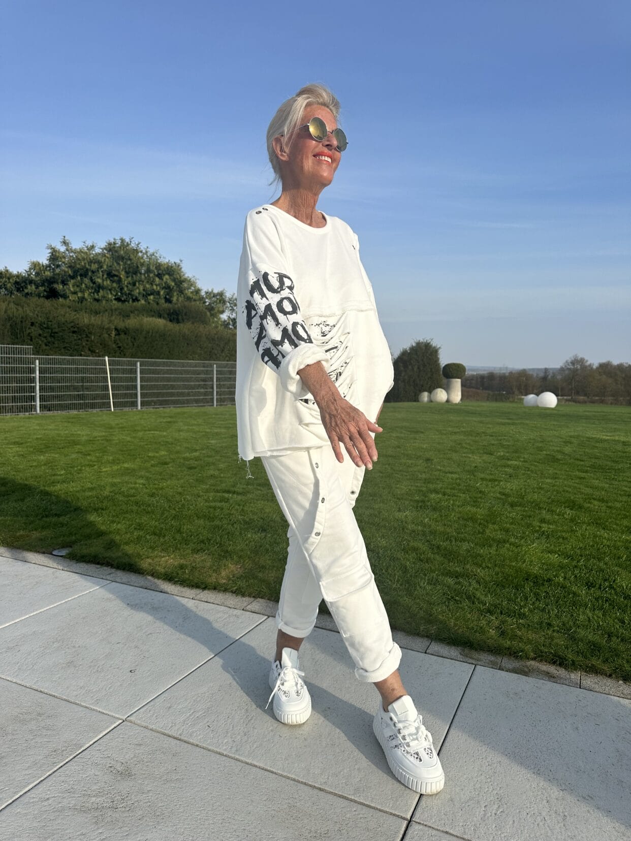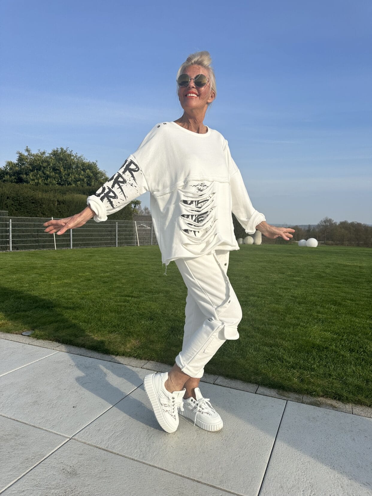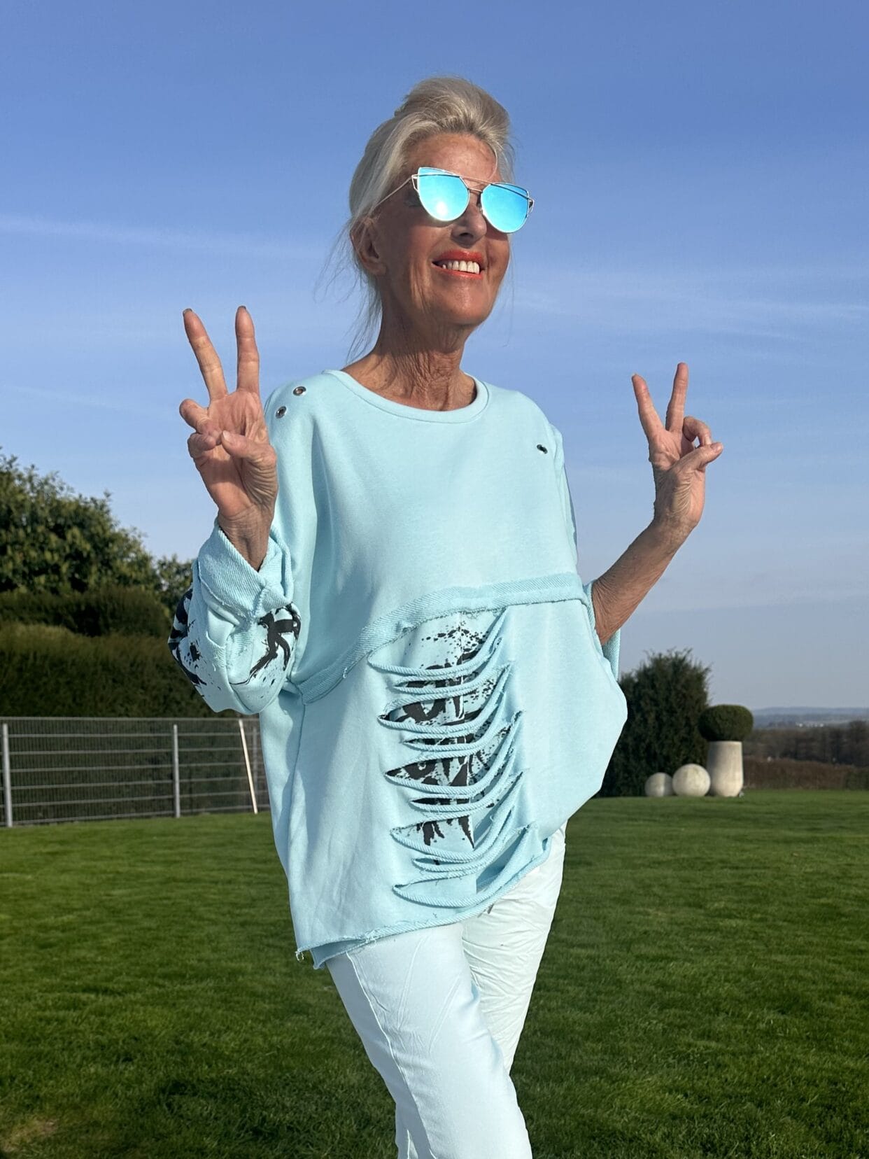 Langarm-Sweater mit schwarzen Text-Motiven und Used-Anteilen sowie Ösen in zwei Farben.