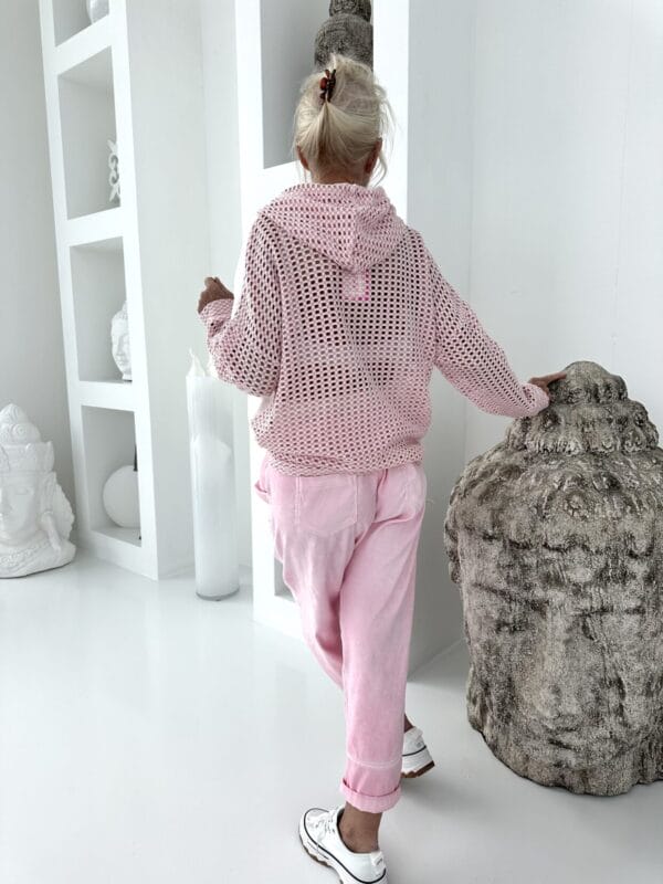 Leichtes Kapuzenshirt mit Lochmusterung an Rücken, Kapuze und Armen mit einem BlingBling-Textmotiv auf der Vorderseite.