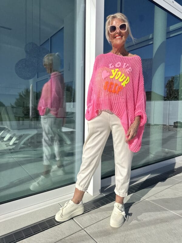 Leichter Netzpulli mit knalligem Text-Motiv und 2 Taschen am Bund.