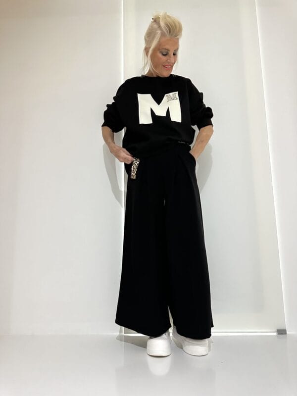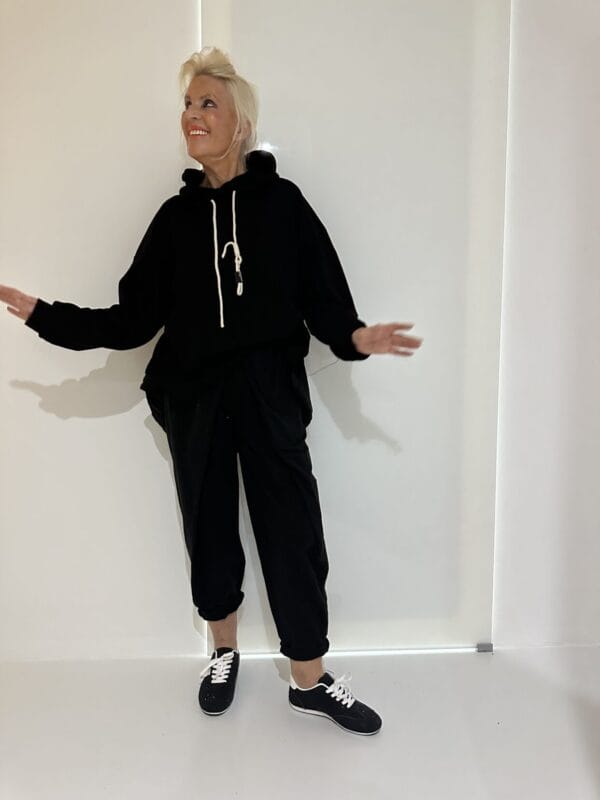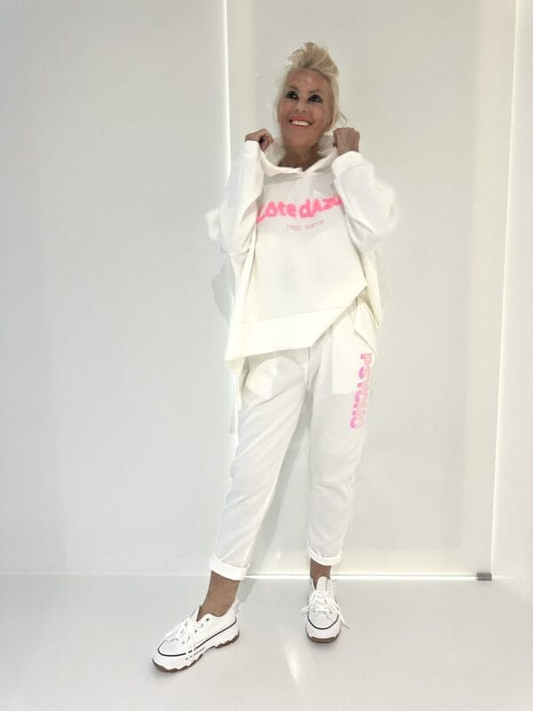 Sportlich-modischer Zweiteiler bestehend aus einem Oversize-Kapuzen-Sweater mit farbigem Motiv sowie einer Schlupfhose mit XL-Taschen und Tunnelzug + Streifen an beiden Teilen.