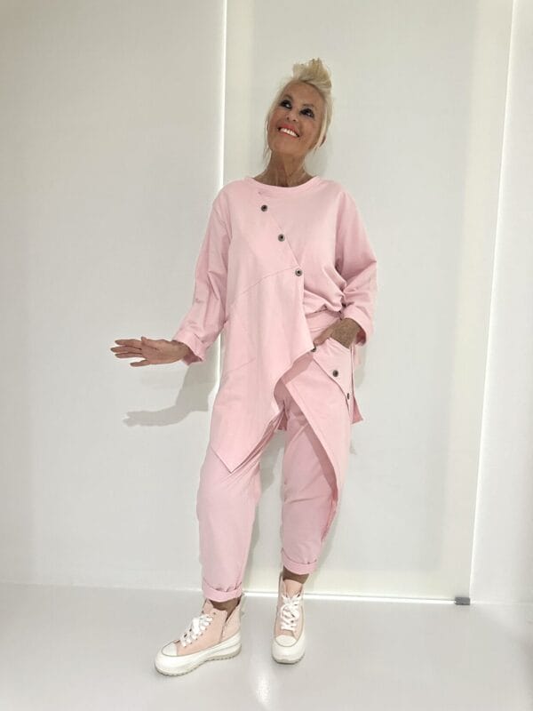 Unifarbener Zweiteiler mit schräg gesetzter Knopfleiste an Oberteil und Hose sowie weiteren Details.