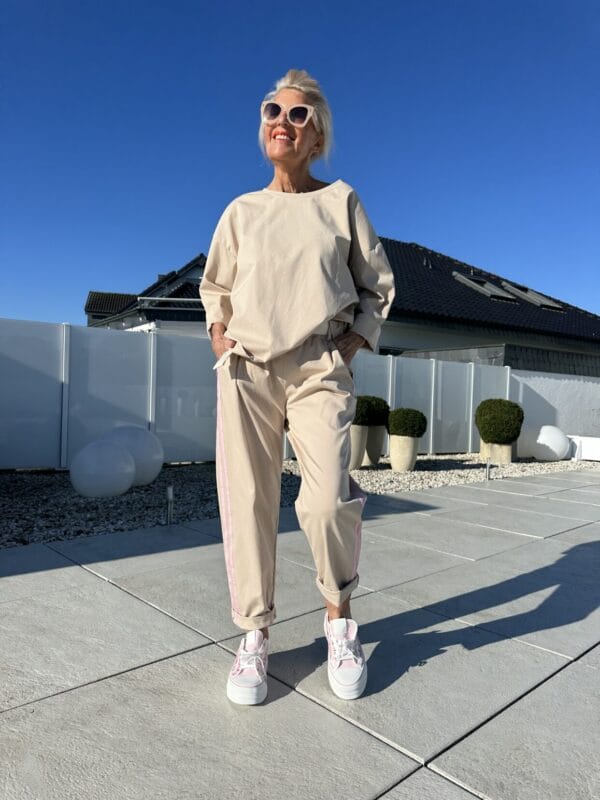 Leichter Zweiteiler in Beige und Mint mit seitlichen Streifen.