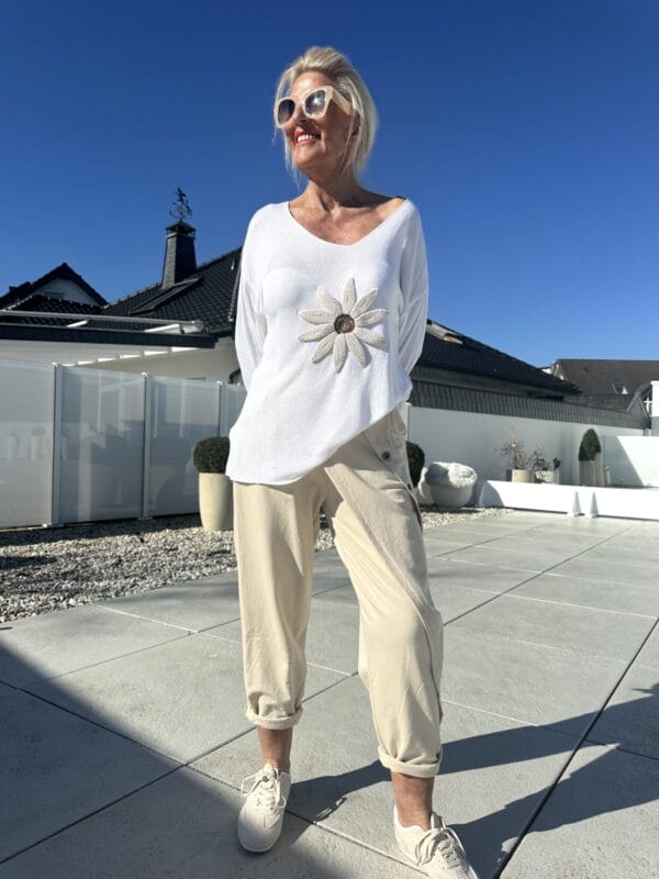 Leichter Sommerstrick in 3 Uni-Farben mit aufgenähtem Blütenmotiv.