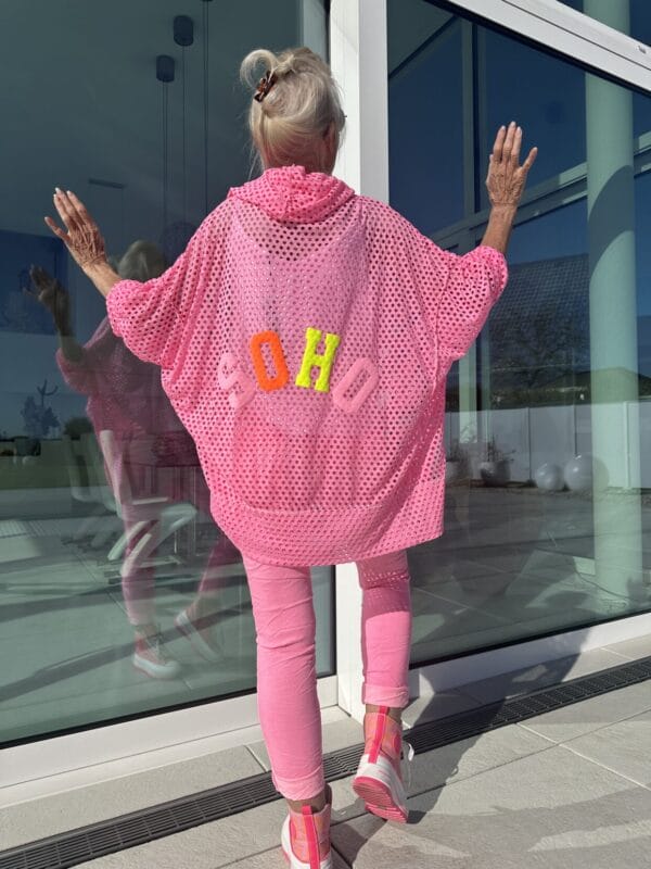 Leichter Long-Hoodie in drei Farben mit knallig-pinkem XL-Text-Motiv auf dem Rücken.